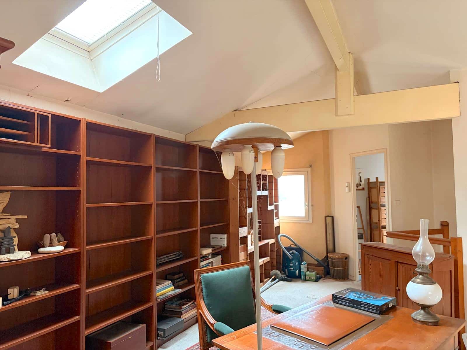 À l’étage, un palier en mezzanine dessert une pièce avec vélux, pouvant accueillir un espace nuit supplémentaire, un bureau ou une salle de loisirs.